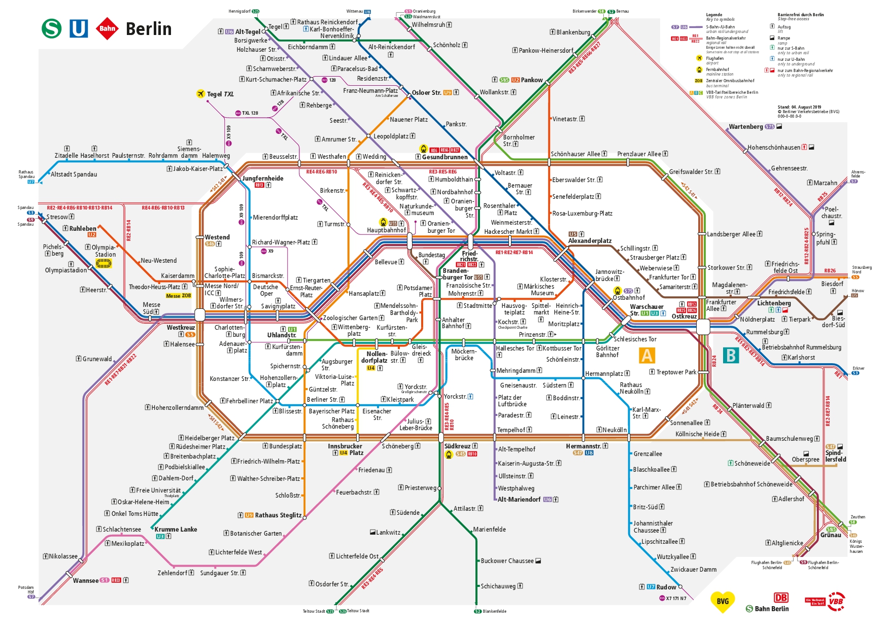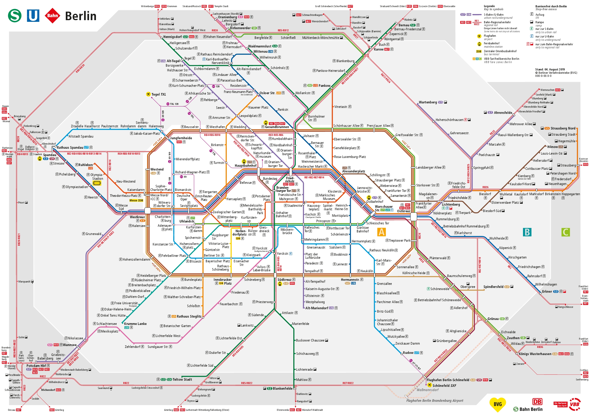 베를린 교통 주식회사(BVG)에서 제공하는 최신 지하철 및 열차 ABC 구역 노선도, (2019년 8월 4일)입니다.