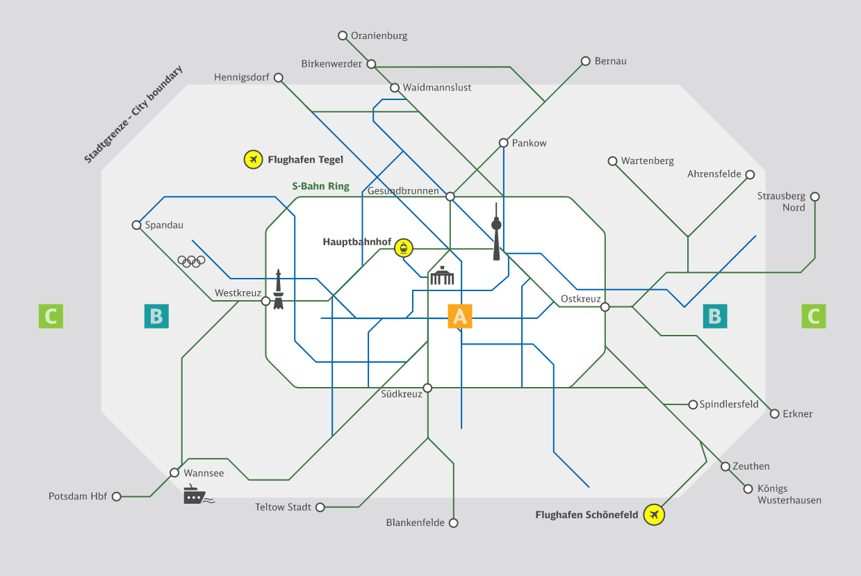 해당 지도는 에스반 및 지역 열차(RE)에서 손쉽게 볼 수 있는 지도입니다. 베를린의 대중교통 요금 전 구역인 ABC 구역(아래 이미지 확인)의 에스반, 우반 그리고 지역 열차 노선을 한눈에 확인할 수 있습니다. 또한, 역 별로 엘리베이터와 램프(경사로) 유무를 아이콘을 통해 표기하고 있습니다. 에스반과 우반이 동시에 정차하는 역의 엘리베이터의 경우, 에스반 정거장(초록색)으로만 엘리베이터 사용이 가능한지 우반 정거장(파란색)으로만 사용이 가능한지 색으로 구분하고 있습니다.