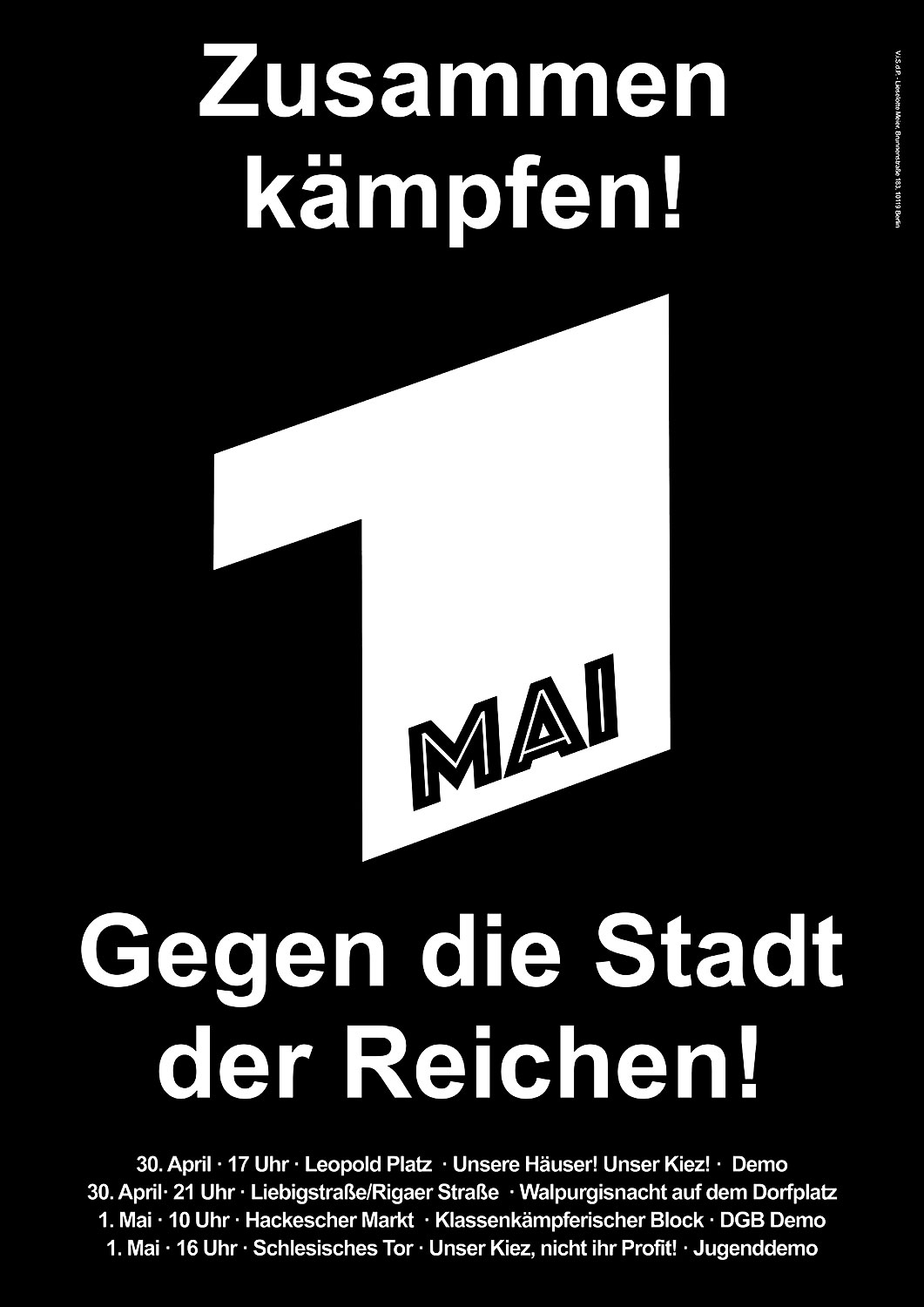 노동절은 베를린 경찰들이 가장 긴장 상태에 들어가는 날입니다. 노동절 시위는 5월 1일 한 곳에서 진행되는 것이 아니라, 4월 30일 저녁 전야제 시위부터 혁명의 5월 1일 시위까지 수많은 시위가 도시 곳곳에서 각종 현안에 맞춰 진행되고, 올해는 점점 더 부자를 위한 도시가 되고 있는 베를린 시의 문제점에 함께 연대하여 싸우자는 시위로 진행됩니다. 더 많은 시위 일정은 포스터 아래 링크를 확인하시면 됩니다.