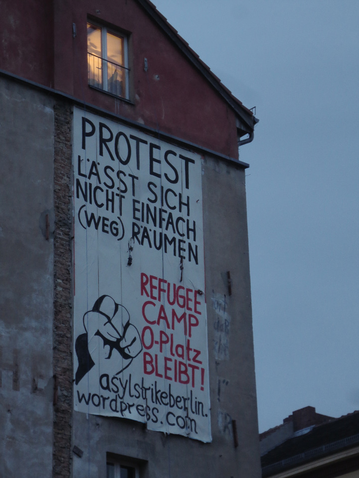 경찰의 강제퇴거 작전을 피해 학교 지붕에 남아있는 난민들은 SNS 등을 통해 "Humanität(인도주의, 박애)"를 외쳤다. 그들이 고향으로 돌아간다면, 임시 캠프에서 생활하는 것보다 더 열악하고 위험한 상황에 처하게 된다. 한 독일 기사는 난민들 고향의 삶의 수준이 끔찍한(katastrophal) 즉, 재앙 혹은 파국적인 상황이라고 표현했을 정도다. 지난 몇 개월간 난민을 내쫓기 위한 시 정부 그리고 지역구 노력과 난민을 지키기 위한 시민들과 시민단체들의 노력은 끊임없이 마찰을 빚었다.