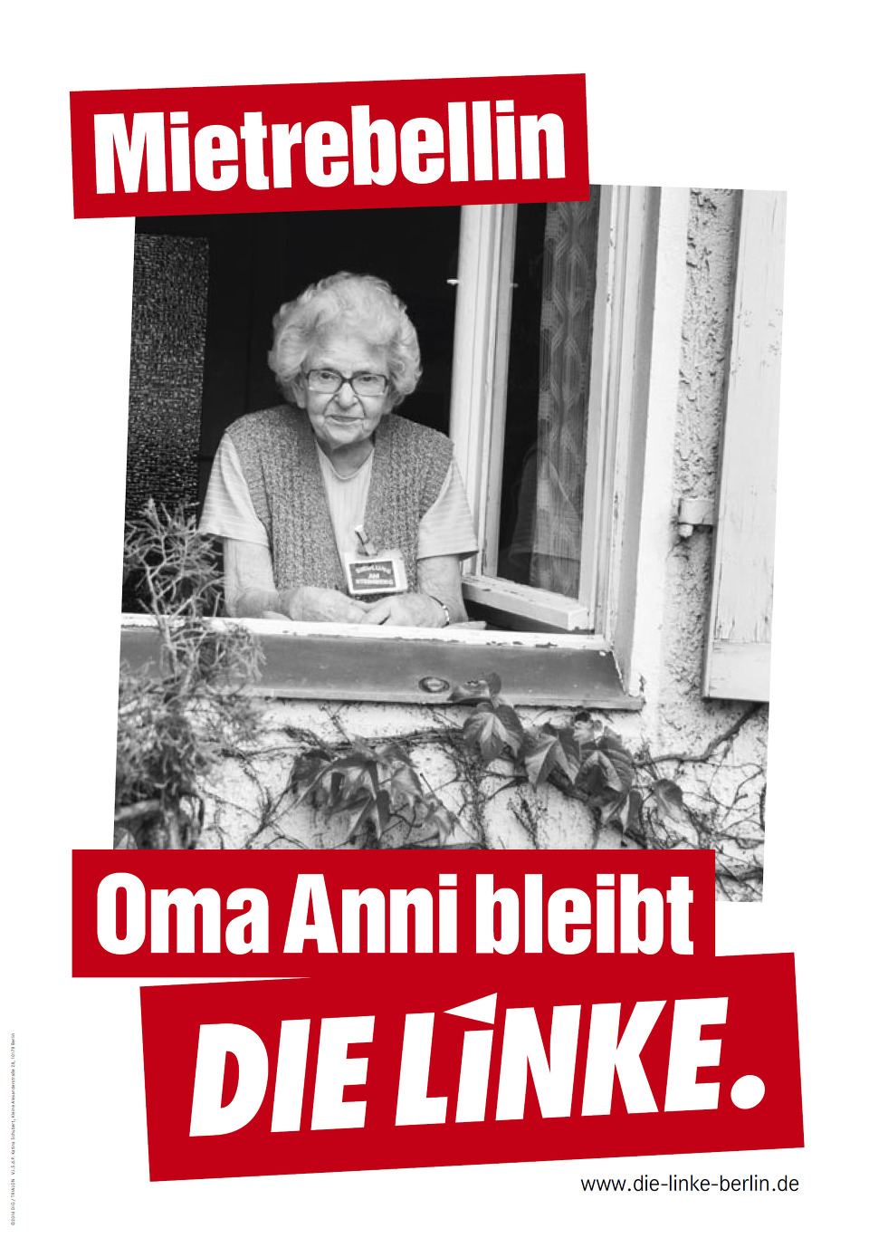 좌파당의 선거 포스터 중 주거 관련 테마. 임대료 반항아. “애니 할머니는 (지금 살고 있는 집에) 남는다.” © Die Linke Berlin