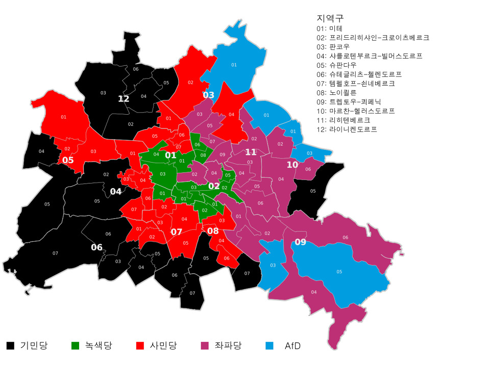 세 장의 투표 용지에 도장을 찍어야하는 베를린 주 의회 선거가 종료 되었다. 첫번째는 베를린의 총 78개 선거구의 직선의원을 뽑기 위한 투표 용지다. 두번째는 베를린 주 의회를 위한 정당 투표용지다. (의석배분 최소 득표율 5%) 세번째는 12개 지역구 의회(지역구에 따라 최대 55석 의석)를 위한 정당 투표용지다. (의석 배분 최소 득표율 3%)