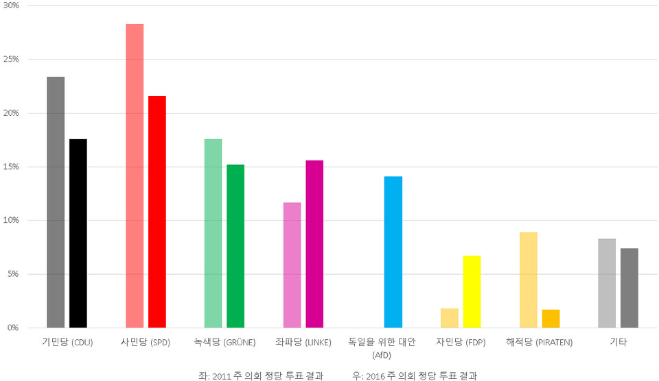 2006년 58%로 역사상 가장 낮은 투표율 그리고 2011년 60,2%로 두번째로 낮은 투표율을 지나, 이번 선거에선 66.6%의 투표율로 마무리 되었다. 선거 결과는 지난 기사(극우 정당의 약진, 변화하는 독일의 지방 정치)에서 소개한 예측과 큰 차이도 그리고 이변도 없었다. 하지만 예상된 결과임에도 쓰라린 현실을 고스란히 보여줬다.